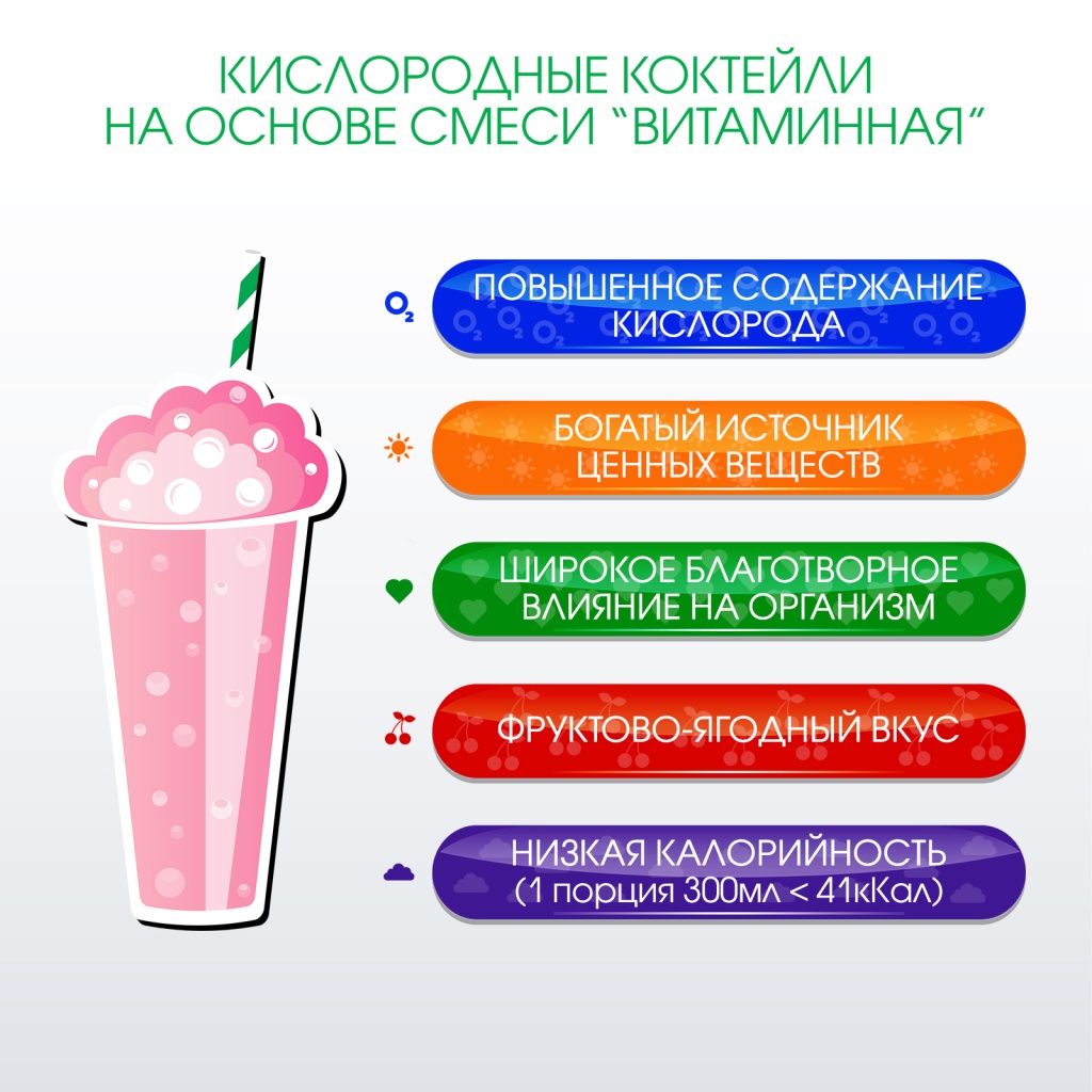 Кислородные коктейли на основе композиции ВИТАМИННАЯ - намного больше, чем классические кислородные коктейли. Их отличает высокое содержание полезных веществ. Это продукты высокой биологической ценности с многогранным комплексным действием. Они укрепляют и поддерживают работу иммунной, нервной, дыхательной и сердечно-сосудистой систем; улучшают функции печени, почек, кишечника, кожи; придают силы, поднимают настроение, укрепляют сон; являются идеальным продуктом питания для контроля веса и т.д.