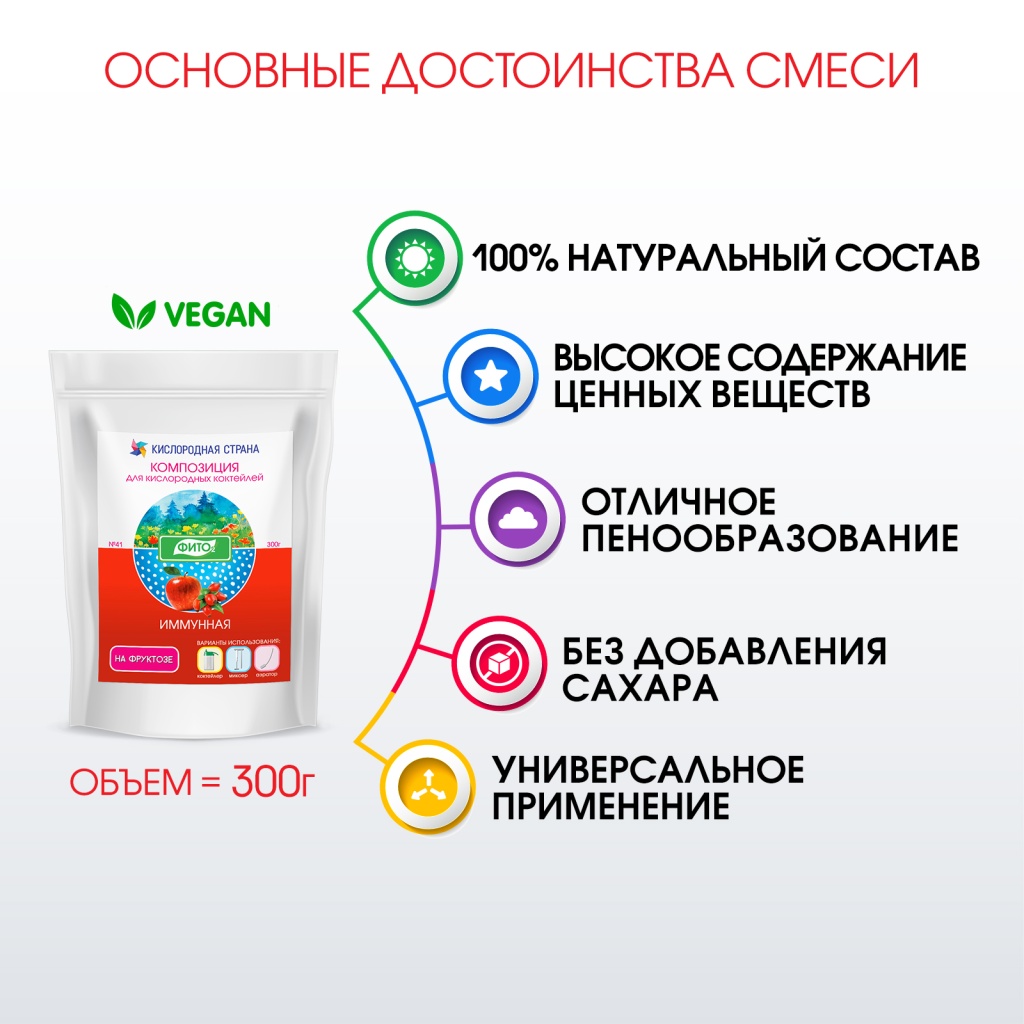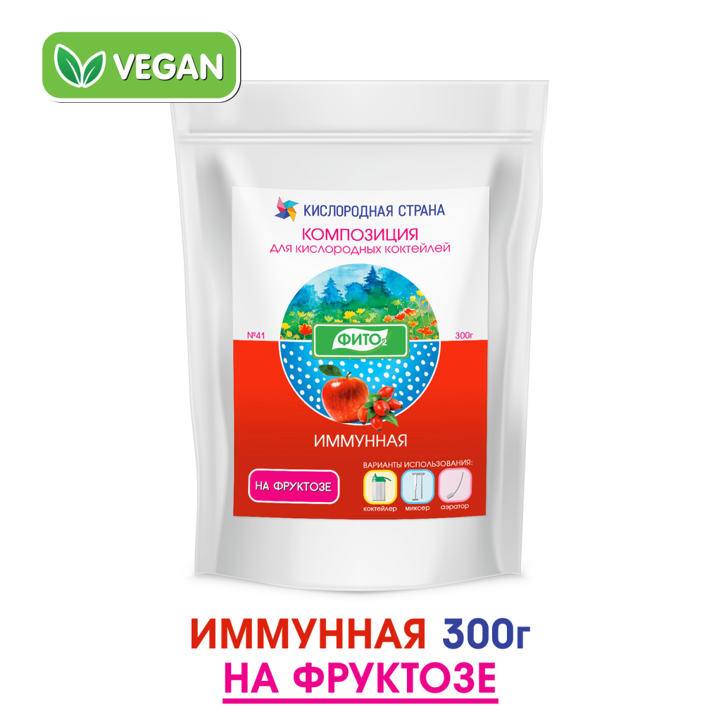 ИММУННАЯ сухая пенообразующая смесь на основе фруктозы (без добавления сахара), экстракта корня солодки и комплекса ценных природных веществ. Используется для приготовления кислородных коктейлей повышенной ценности любым способом - при помощи миксера, коктейлера или аэратора. Обеспечивает великолепное пенообразование и высокое содержание кислорода, растворимых волокон, витаминов, иммунокорректоров и т.д.