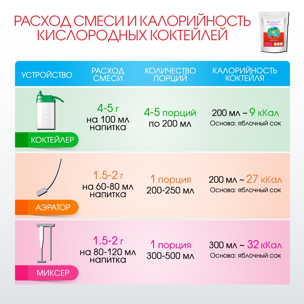 РЕКОМЕНДУЕТСЯ для кислородных коктейлей высокой биологической ценности в детских учреждениях, санаториях, фито-барах, центрах коррекции веса, домашних условиях и т.д.