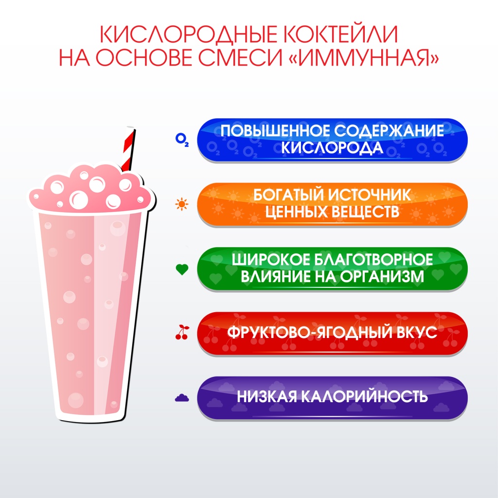 Кислородные коктейли на основе композиции ИММУННАЯ - продукты высокой биологической ценности, настоящие целебные многогранники. Они улучшают функции иммунной, дыхательной, нервной, сердечно-сосудистой, мочеполовой систем, печени и органов ЖКТ, кожи; активизируют процессы детоксикации организма; обладают противовирусным, антибактериальным и антигельминтным действием; нормализуют состояние кожи и т.д.