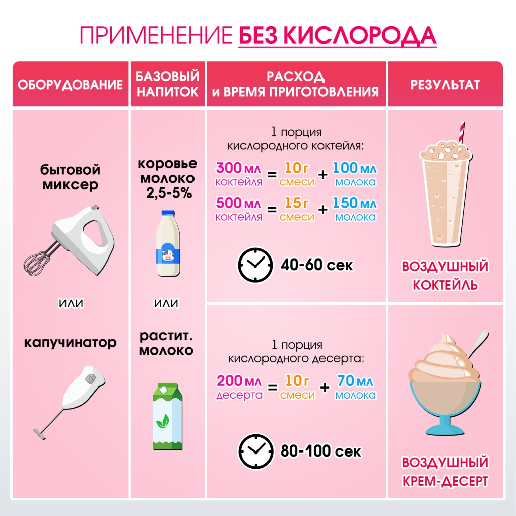 РЕКОМЕНДУЕТСЯ для приготовления кислородно-молочных коктейлей и крем-десертов.