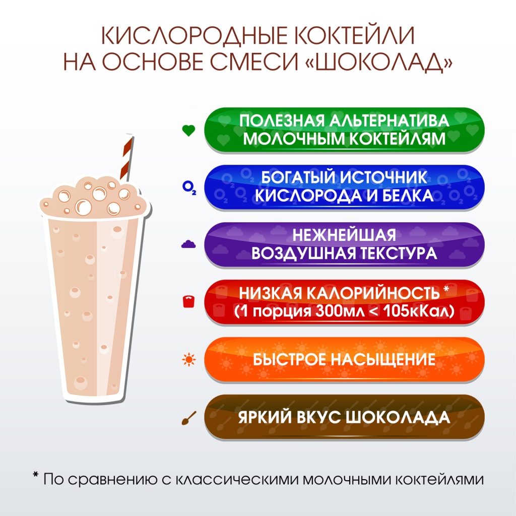 Специальная пенообразующая смесь для приготовления кислородно-молочных коктейлей со вкусом ШОКОЛАДА на основе молока, в том числе, растительного. Обеспечивает великолепное пенообразование и изумительный вкус. Используется только с кислородным миксером.