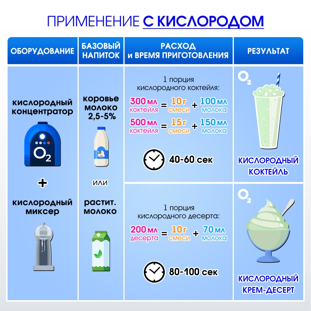 РЕКОМЕНДУЕТСЯ для приготовления кислородно-молочных коктейлей и крем-десертов.