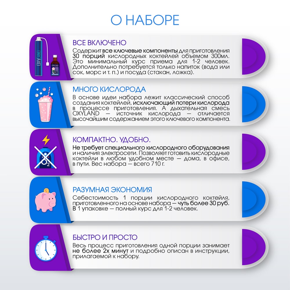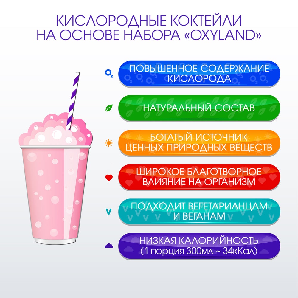 Хотите начать делать кислородные коктейли дома? Тогда рекомендуем обратить внимание на набор "OXYLAND" со вкусом Черная смородина. Он позволяет готовить кислородные коктейли повышенной биологической ценности в любом удобном месте – дома, в офисе, в пути. Этот набор рекомендуется для минимального курса приема кислородных коктейлей на одного человека (ежедневно по 2 порции в течение 2-х недель).